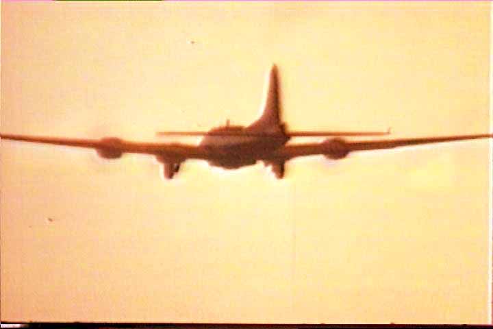 B-17G Tanker 12 climbs into the setting sun. Hemet Field, California. (08/78)