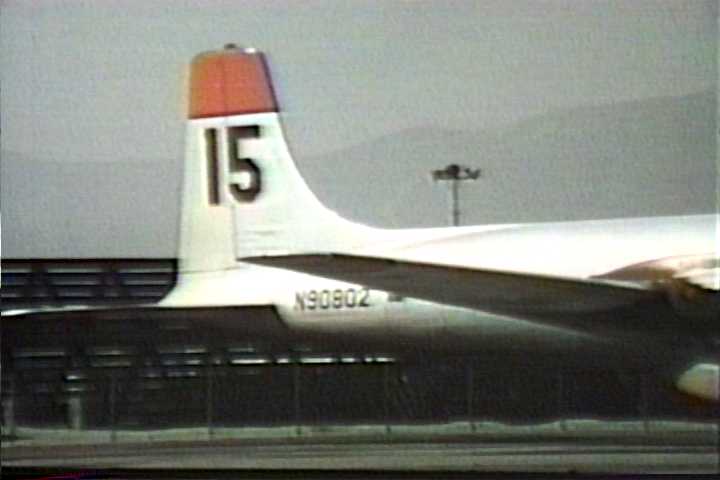 DC-7 Tanker 15 (N90802) rests between missions at Ontario Airport, California. (09/23/75)