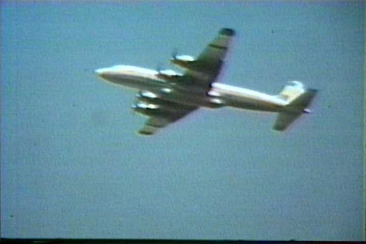 DC-7 Tanker 66 on borate dropping run over brush fire northwest of San Bernardino, California. (09/26/75)