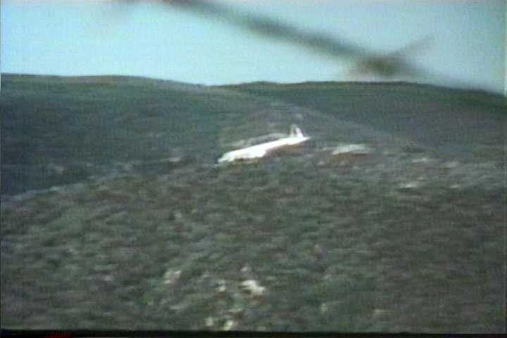 DC-7 Tanker on borate dropping run over brush fire northwest of San Bernardino, California. (09/26/75)