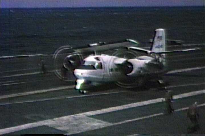 Grumman C-1A Trader taxies towards the aft end of the angle deck of U.S.S. Kittyhawk prior to take off (06/72).