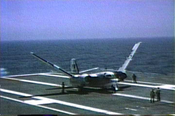Grumman C-1A Trader continues to unfold its wings prior to take off from U.S.S. Constellation during carrier quals (08/71).