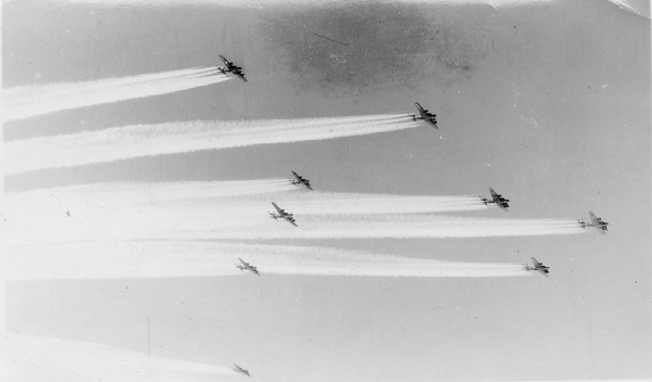 B-17s of the 379th Bomb Group, 525th and 527th Squadrons stream contrails on way to target during a mission in 1943.
