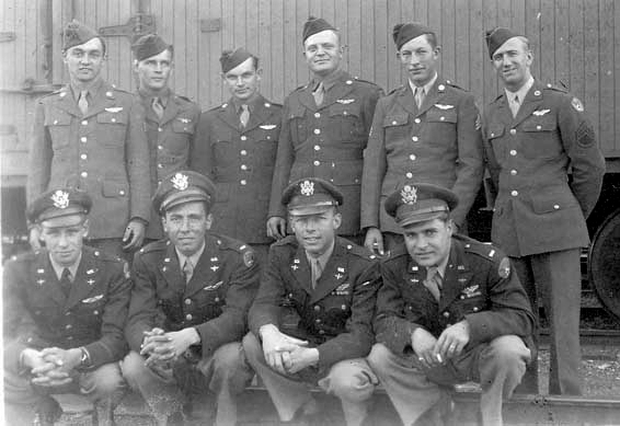 FRONT ROW, left to right: 2nd Lt. Joseph K. "Murphy" Uniszkiewicz (Navigator, KIA 05/8/44), 2nd Lt. John E. Clayton (Pilot), 2nd Lt. Winthrop A. "Jack" Jackson Jr (Co-pilot WIA 5/8/44), 2nd Lt. Richard M. "Dick" Dolf (Bombardier WIA 01/30/44).