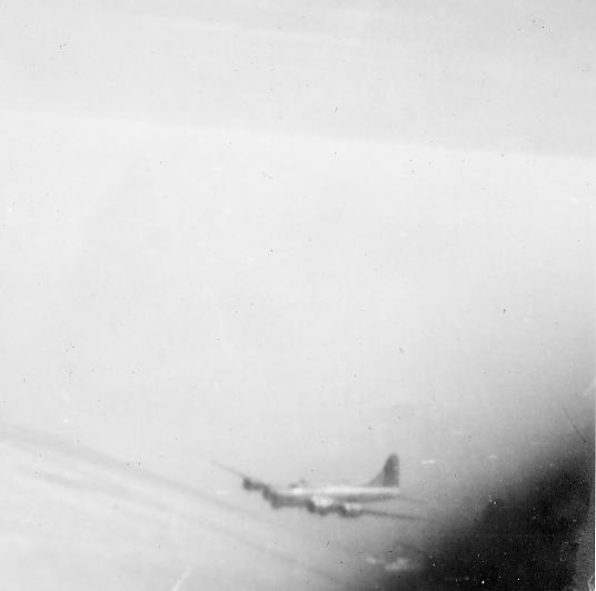 384th Bomb Group B-17s returning from a bombing mission cross the English Channel. German occupied France is in the distance.