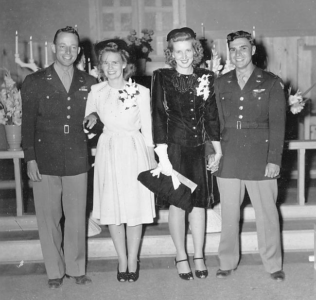 Lt. Winthrop Jackson, Dorothy (Dottie) Case Jackson, Lt. Richard Dolf and Nell Gwen Dolf just after a double wedding ceremony at the Dalhart Army Air Base Chapel, Dalhart, Texas.