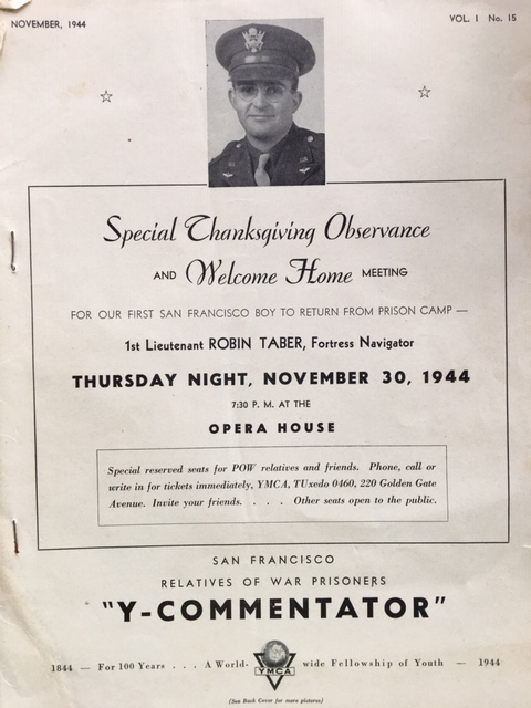 As a POW, Robin E. Taber was transferred to a hospital in Poland, due to some severe mental or physical problems that he experienced at Stalag Luft III, and was subsequetly repatriated on the Swedish vessel Gripsholm in June or July of 1944. This document is from Thanksgiving 1944 after he was repatriated and safely home.
