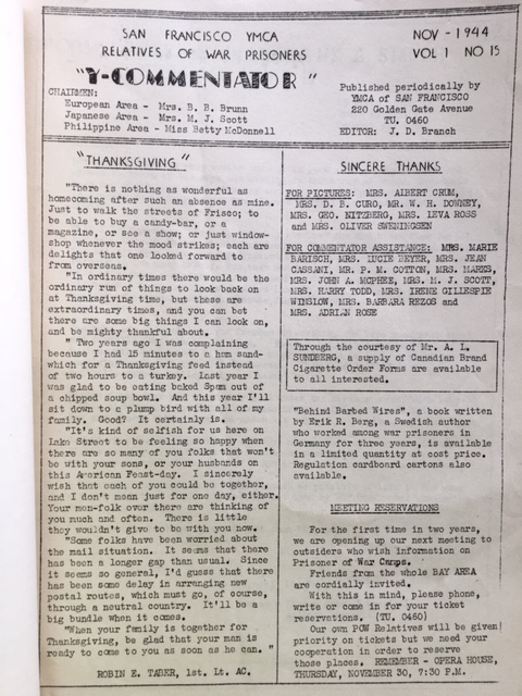 As a POW, Robin E. Taber was transferred to a hospital in Poland, due to some severe mental or physical problems that he experienced at Stalag Luft III, and was subsequetly repatriated on the Swedish vessel Gripsholm in June or July of 1944. This document is from Thanksgiving 1944 after he was repatriated and safely home.
